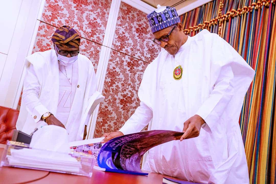 President Muhammadu Buhari, on Friday, met with Governor Babajide Sanwo-Olu of Lagos State behind closed doors where he received pictorial reports on properties damaged by hoodlums during #EndSARS protests in the state.