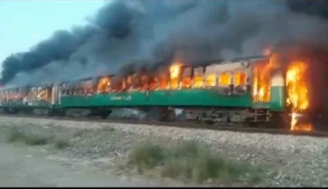 At least 65 passengers have been confirmed killed and about 40 wounded after a train caught fire in south-eastern Pakistan on Thursday, officials said, in one of the deadliest rail accidents in the country.