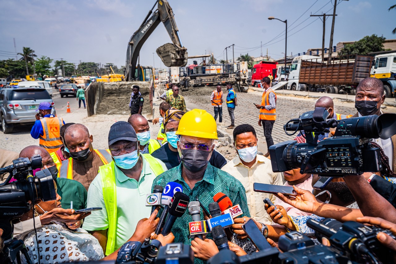 Minister of Works and Housing, Mr. Babatunde Fashola, SAN (middle) flanked by the Federal Controller of Works in Lagos State, Engr. Olukayode Popoola (second left) and others as he speaks with journalists at the Mile 2 end of Section II shortly after an inspection tour of the Reconstruction of Apapa – Oworonshoki -Ojota Expressway: Section I Sub- Sections A, B, D and Sections 3 & 4 in Lagos State…on Monday
