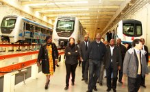 Lagos State Governor, Mr. Babatunde Fashola SAN (right) with the Commissioner for Establishment and Training, Mrs. Florence Oguntuase (left), the Managing Director of the Lagos Metropolitan Area Transport Authority (LAMATA), Dr. Dayo Mobereola (middle) and other members of his entourage examine the seat of one of the completed coaches at Dalian Locomotive & Rolling Stock Co. Ltd., during an inspection of the production factories of the Dalian Group in Dalian, China.