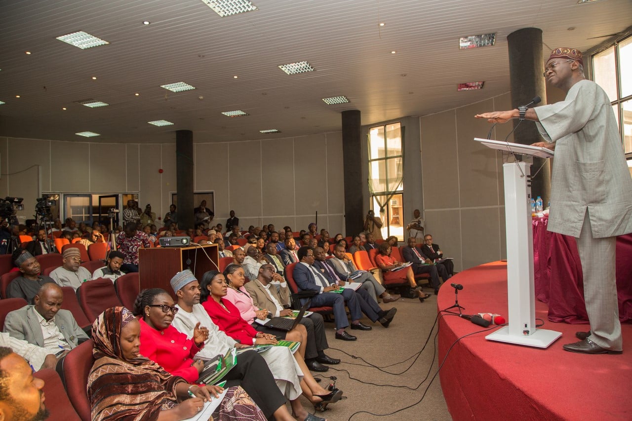 Minister of Power, Works & Housing, Mr Babatunde Fashola, SAN (right) speaking on the theme, “The Federal Government Commitment to the Power Sector Recovery Programme (PSRP)” during a Media Engagement Workshop on the PSRP at the Auditorium of the Ministry of Power,Works and Housing Headquarters, Power House, Maitama, Abuja.