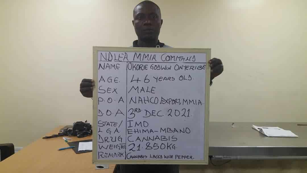 In the same vein, NDLEA operatives at the Murtala Muhammed International Airport, MMIA, Lagos have arrested one Okorie Godwin Onyeribe over his attempt to export 21.85kg of cannabis concealed in foodstuff to London, UK. He was nabbed at the NAHCO export shed of the airport on Friday 3rd Dec.