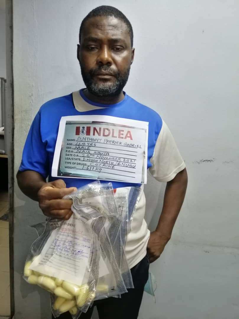 A 44-year-old father of three, Gabriel Anthony Patrick, has been arrested by operatives of the National Drug Law Enforcement Agency, NDLEA, at the Nnamdi Azikiwe International Airport, NAIA, Abuja for ingesting 96 pellets of cocaine, which he excreted in the custody of the Agency.