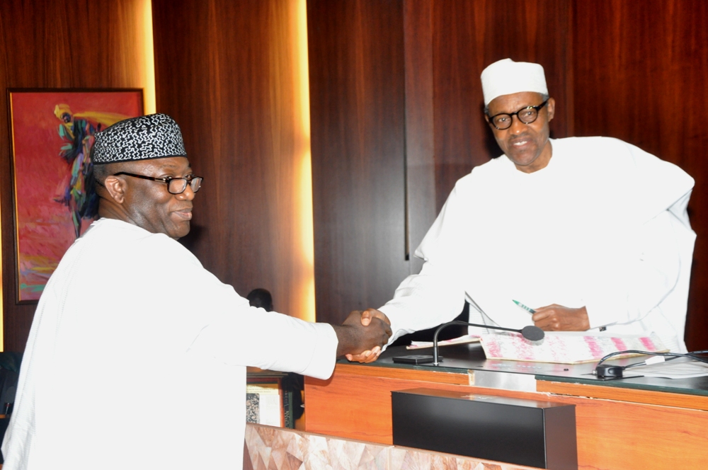 President Muhammadu Buhari and Dr. Kayode Fayemi during his swearing-in as Solid Minerals Minister at the State House, Abuja…on Wednesday.