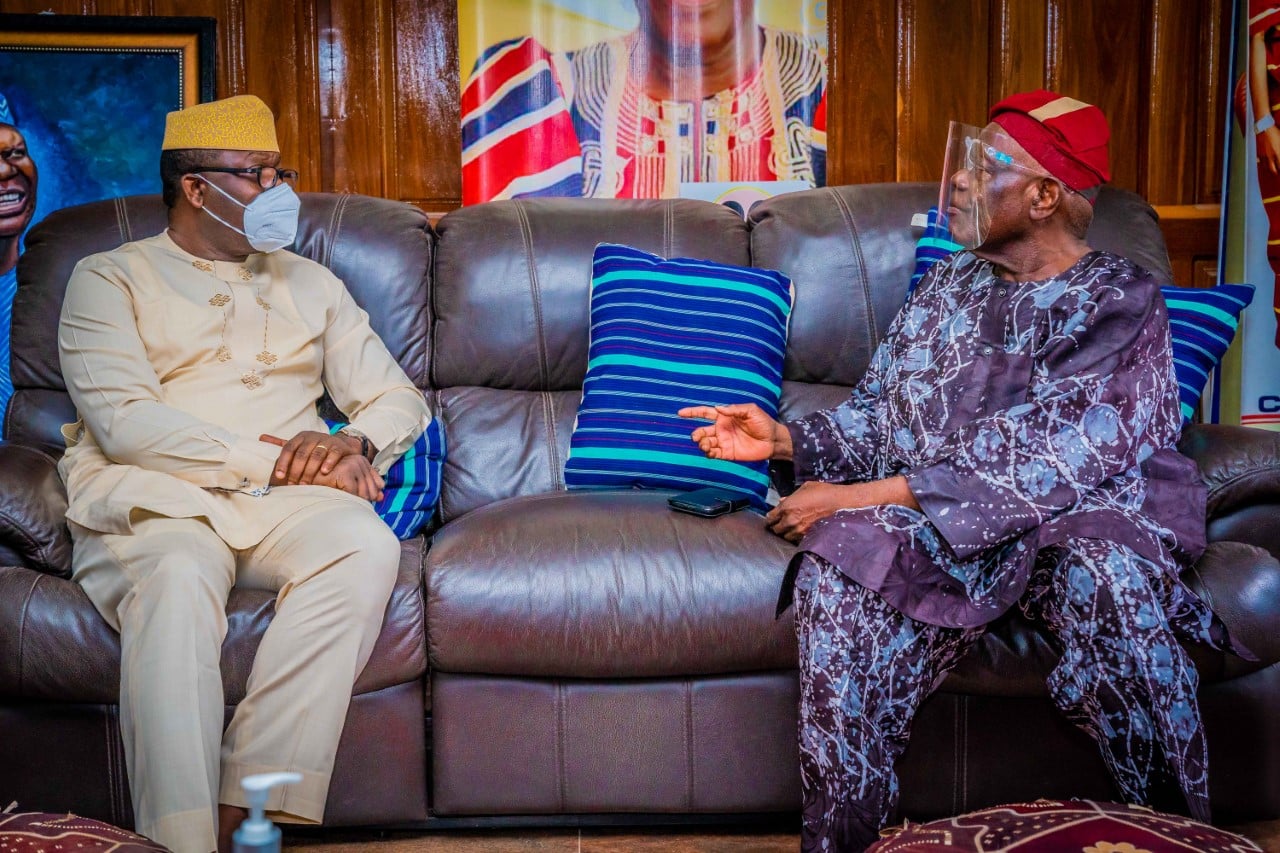 Ekiti State Governor, Dr Kayode Fayemi (left), with former Interim National Chairman of the All Progressives Congress (APC), Chief Bisi Akande; when the governor visited Akande at his country home in Ila Orangun, Osun State. Fayemi and Akande Fayemi and Akande