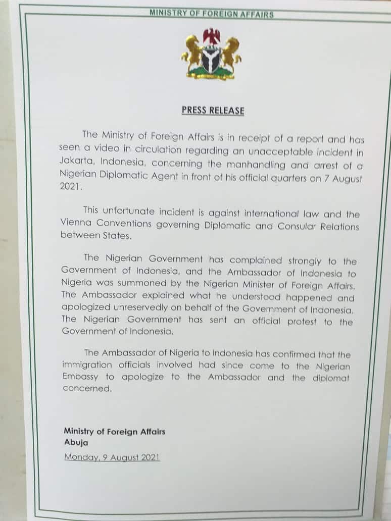 It reads: “The Ministry of Foreign Affairs is in receipt of a report and has seen a video in circulation regarding an unacceptable incident in Jakarta, Indonesia, concerning the manhandling and arrest of a Nigerian Diplomatic Agent in front of his official quarters on 7 August 2021.