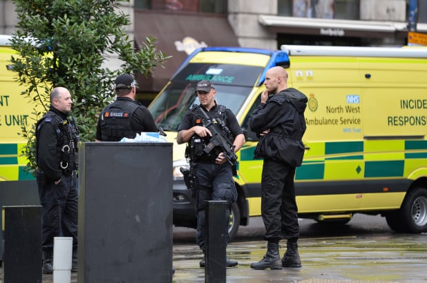 The Manchester Evening News reported that one of the victims was seriously injured. A video showed a masked man being detained while lying on the ground as an officer held an electric shocker.