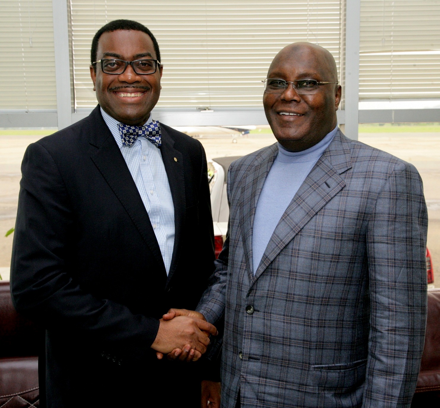 Former Vice President and chieftain of the All Progressives Congress (APC), Atiku Abubakar (right), congratulating the President-elect of the African Development Bank (AfDB), Dr Akinwunmi Adesina, shortly before Atiku’s departure to South Africa on an official visit…on Tuesday