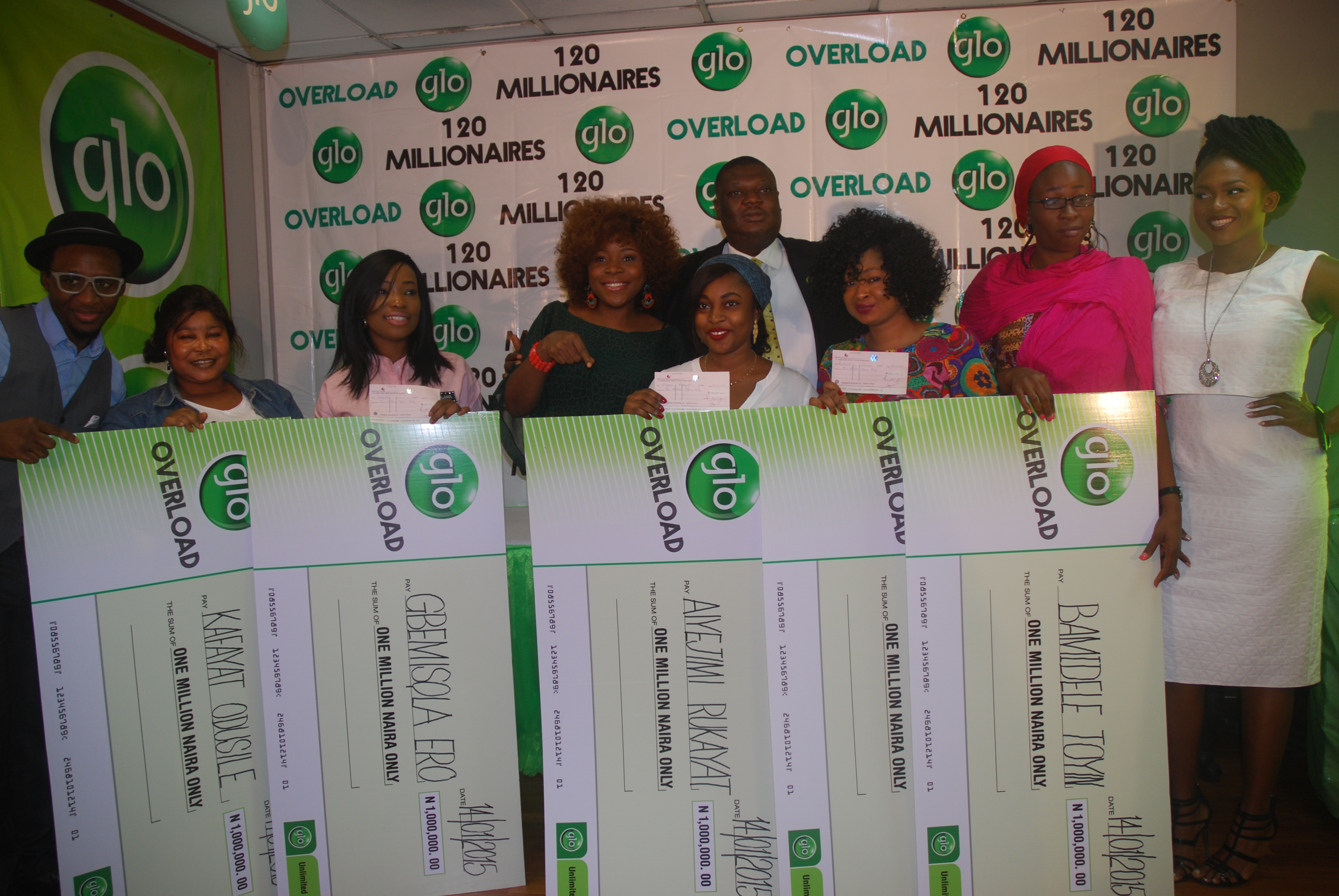 From left: Globacom Ambassador, Bez, One million Naira Prize winners, Kafayat Odusile and Gbemisola Ero, singer and Globacom Ambassador, Omawumi, other One million Naira winners, Aiyejimi Rukayat, Rashidat Sosanya and Bamidele Toyin, and Globacom Ambassador, Waje, at the ceremony to hand over cheques of N1 million each to the first batch 20 winners in the N120 million Overload promo at Globacom headquarters, Lagos…on Wednesday