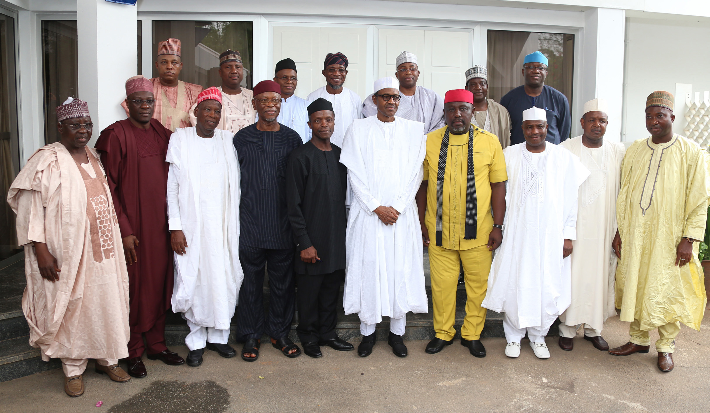 Front Row (L-R) Governors Tanko Al-Makura (Nasarawa); Abdulfatah Ahmed (Kwara); Governor-elect Abdullahi Umaru Ganduje (Kano); National Chairman, All Progressives Congress (APC), Chief John Odigie Oyegun; Vice President-elect Prof Yemi Osinbajo; President-elect, Major-General Muhammadu Buhari; Imo Governor, Owelle Rochas Okorocha; Speaker and Sokoto Governor-elect; Aminu Tambuwal; Kebbi Governor-elect, Senator Abubakar Baguda Atiku and Deputy Governor-elect, Niger. Back Row: Borno Governor Alhaji Kashim Shettima, Adamawa Governor-elect, Muhammad Bindow Jubrilla, Kaduna State Governor-elect, Mallam Nasir el-Rufai, Osun Governor Rauf Aregbesola, Bauchi State Governor-elect, Mohammad Abubakar, Plateau State Governor-elect, Mr. Simon Lalong and former Governor of Ekiti State Dr. Kayode Fayemi when Buhari met with APC Governors and Governors-elect at the Defence House, Abuja…on Tuesday.