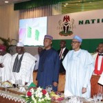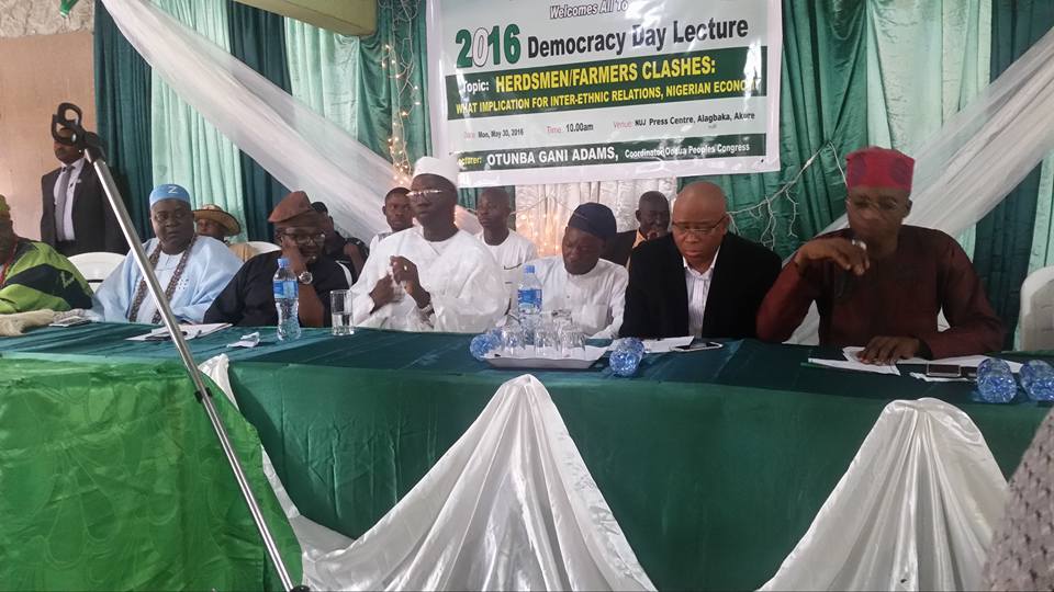 National Coordinator of the Oodua Peoples Congress (OPC), Otunba Gani Adams (middle); Ondo State Commissioner for Information, Mr. Kayode Akinmade (second right), and others during the Ondo State 2016 NUJ Democracy Day lecture held in Akure…on Monday.