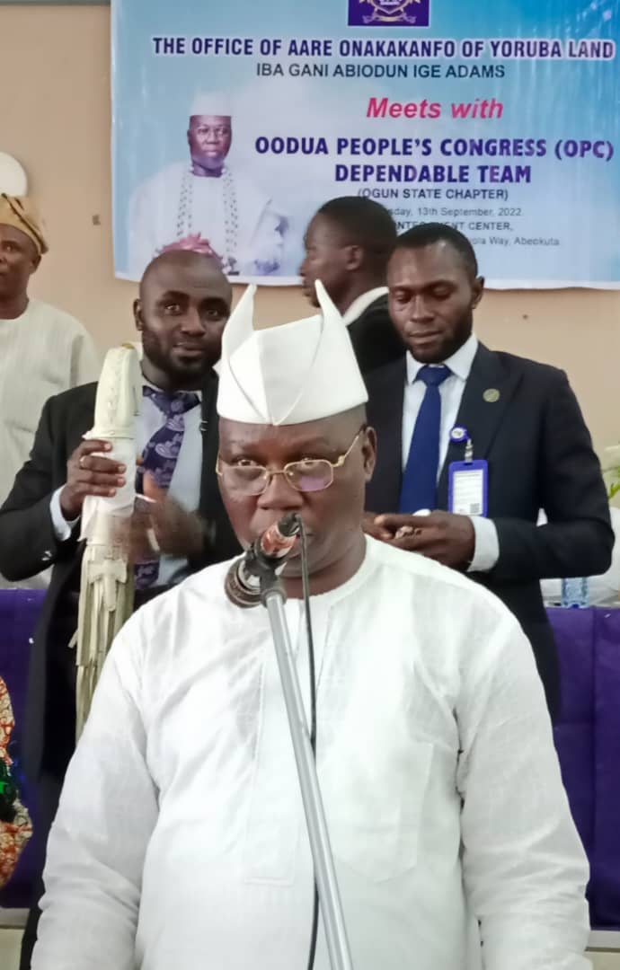 Aare Gani Adams gave the charge in Abeokuta, Ogun State at the second edition of Oodua People’s Congress (OPC) Dependable Security Team meeting held at ONTEC Event Centre.