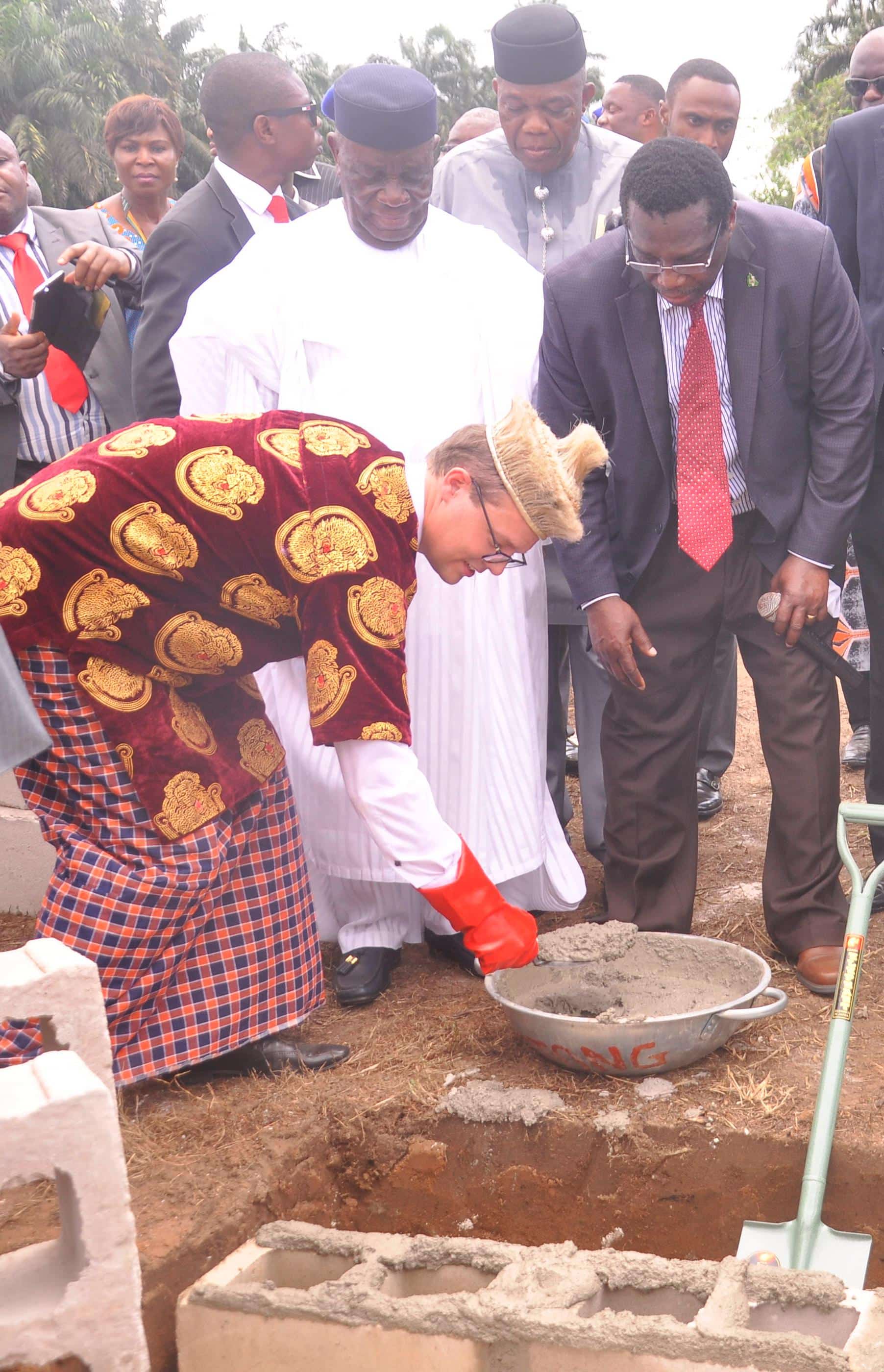 Representative of German Ambassador to Nigeria, H.E. Dr. Bernhard Schlagheck, Mr. Christopher Wenzel, laying the foundation ceremony of the Senate and Administrative Building of the Thompson and Grace Medical University on Friday in Uyo, Akwa Ibom State. Watching in admiration are Mr. Moses Ekpo, Deputy Governor of Akwa Ibom State, and Dr. Emmanuel Umoh, Director of Project Management Office of Thompson and Grace Medical University.