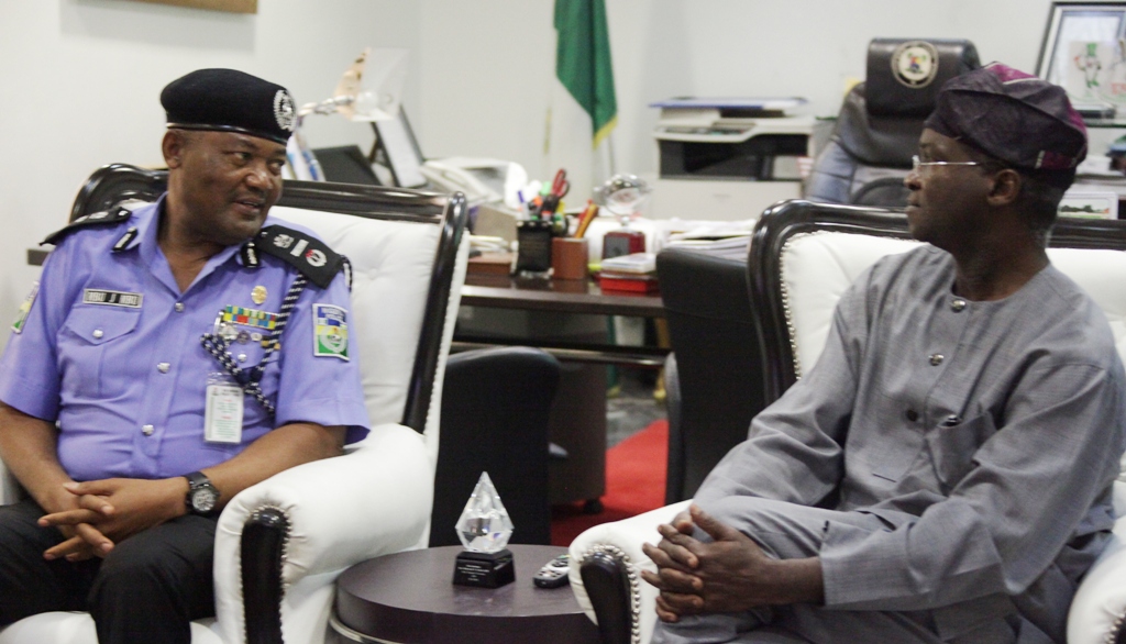 Governor Babatunde Fashola of Lagos State (right) discussing with the Assistant Inspector-General of Police (AIG), Zone II, Mr. Joseph Mbu during his courtesy visit to the governor at the Lagos House, Ikeja…on Tuesday.