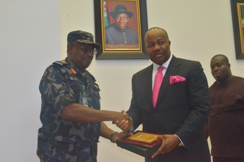 Governor Godswill Akpabio of Akwa Ibom State (right) presenting a souvenir to Air Vice Marshall F. B. Nyokoko, Air Officer Commanding (AOC), Mobility Command, Yenagoa, during a courtesy call in the Governor’s office, Uyo.