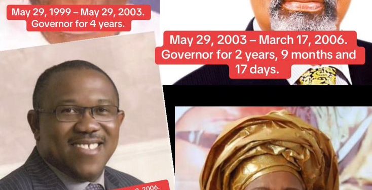 • Peter Obi: First tenure: March 17, 2006, impeached November 2, 2006, returned from impeachment on February 9, 2007 – May 29, 2007. Re-instated June 14, 2007 to March 17- 2010. Second tenure; March 17, 2010 – March 17, 2014. Governor for 7 years, 8 months and 10 days.