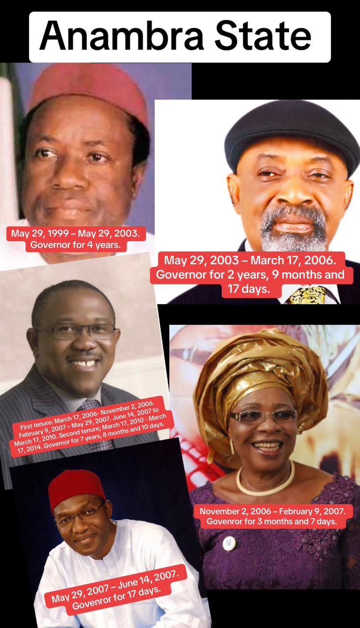 • Dame Virgy Etiaba: November 2, 2006 – February 9, 2007. She was governor for 3 months, 7 days. She is Nigeria’s first female governor, became governor after Obi’s impeachment. She was deputy to Obi.