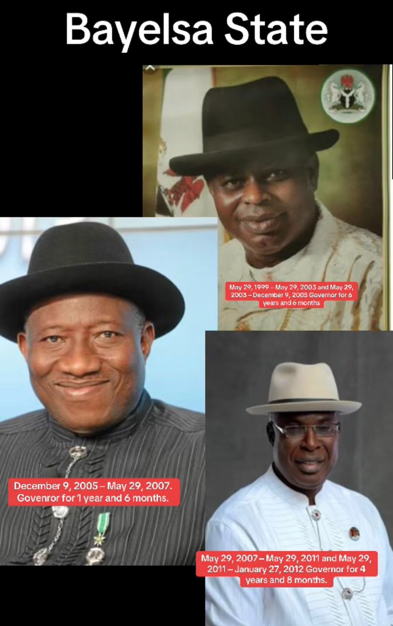 • Dr. Goodluck Jonathan: December 9, 2005 – May 29, 2007. He was governor for 1 year, 6 months. He was deputy to Alamieyeseigha.