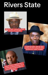 • Rotimi Amaechi: October 25, 2007 – May 29, 2015. He was governor for 7 years, 7 months. He was installed by Supreme Court in his first tenure.