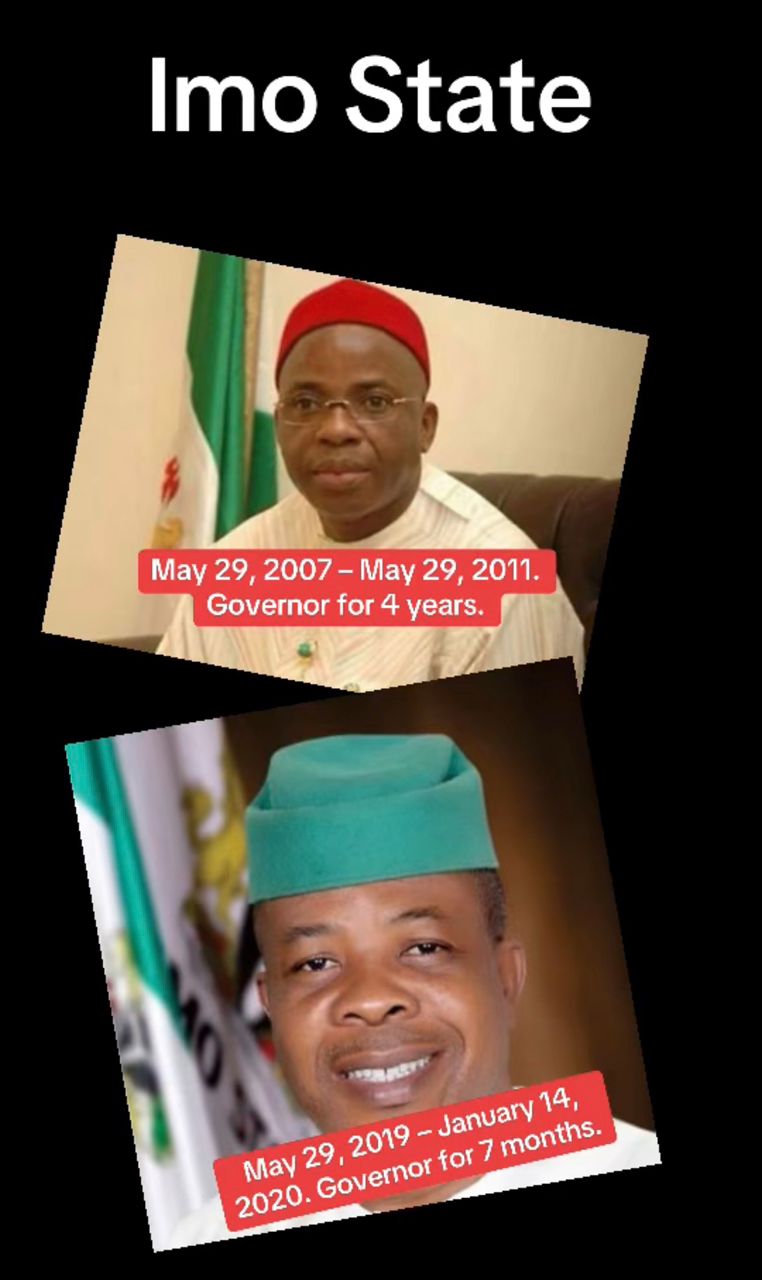 • Hon. Emeka Ihedioha: May 29, 2019 – January 14, 2020. He was governor for 7 months; removed by court.