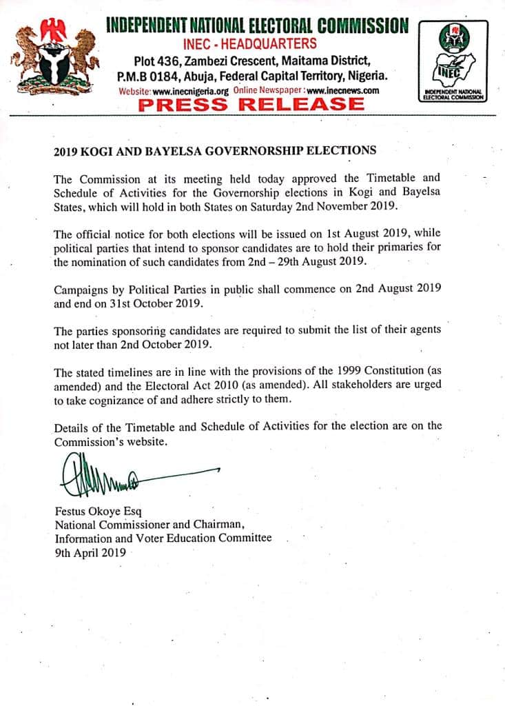 The Independent National Electoral Commission (INEC) has fixed November 2 for the conduct of governorship elections in Kogi and Bayelsa states.