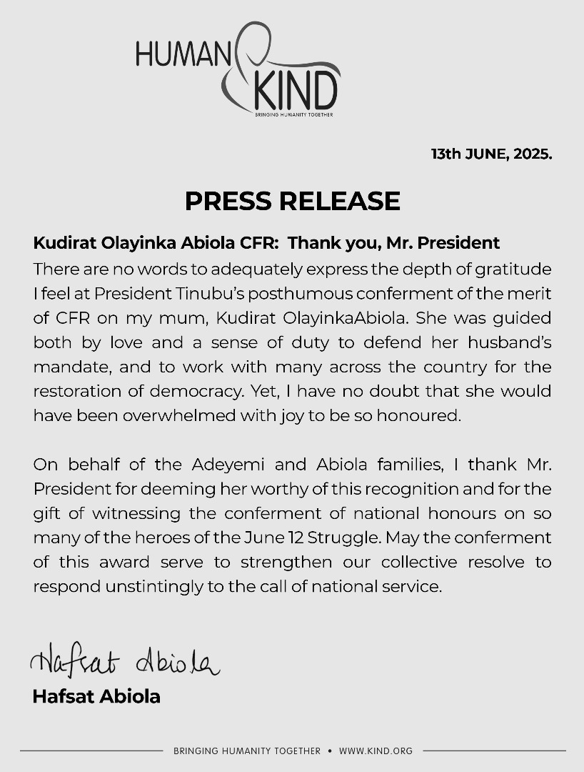 ”There are no words to adequately express the depth of gratitude I feel at President Tinubu’s posthumous conferment of the merit of CFR on my mum, Kudirat Abiola.