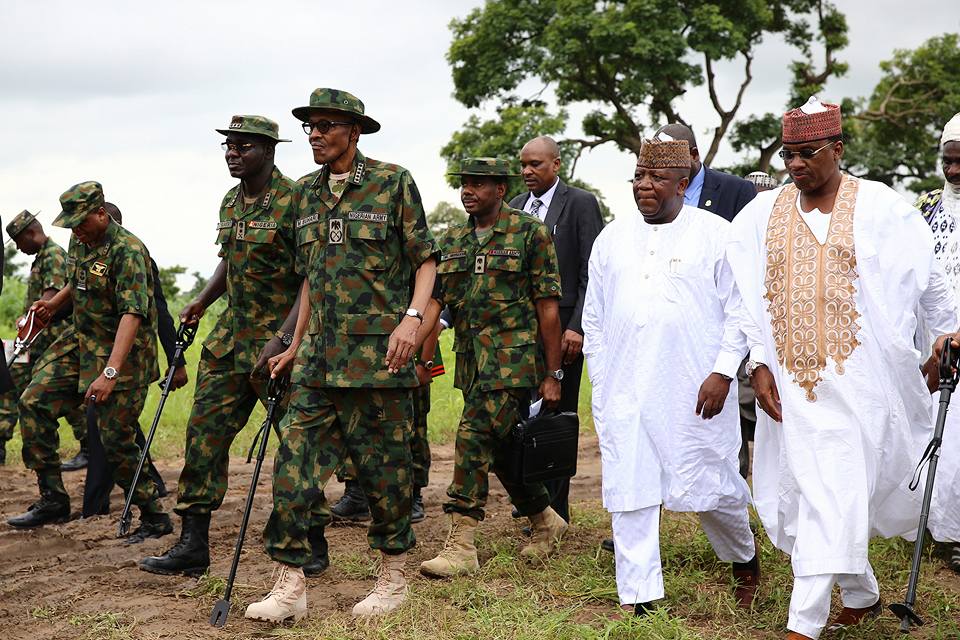President Muhammadu Buhari with others at HQ 1 BDE, Nigerian Army, Dansadau, Zamfara State…on Wednesday
