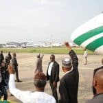 President Muhammadu Buhari alighting from Air Force 001 at the Nnamdi Azikiwe International Airport, Abuja on his arrival from London…on Saturday.