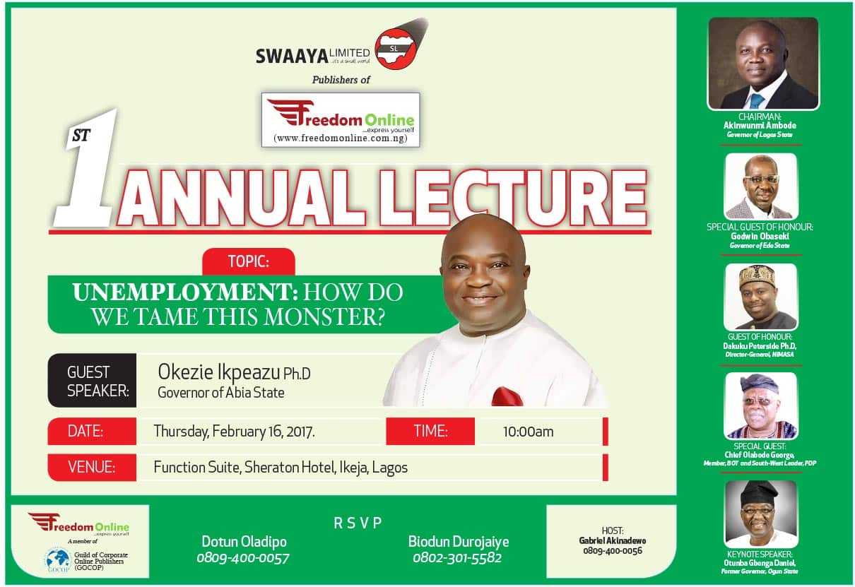 Freedom Online, according to a statement by its Managing Director/Editor-in-Chief, Gabriel Akinadewo, is focusing on how to tackle unemployment during the lecture “because it has become a monster, threatening to consume the nation-state called Nigeria.
