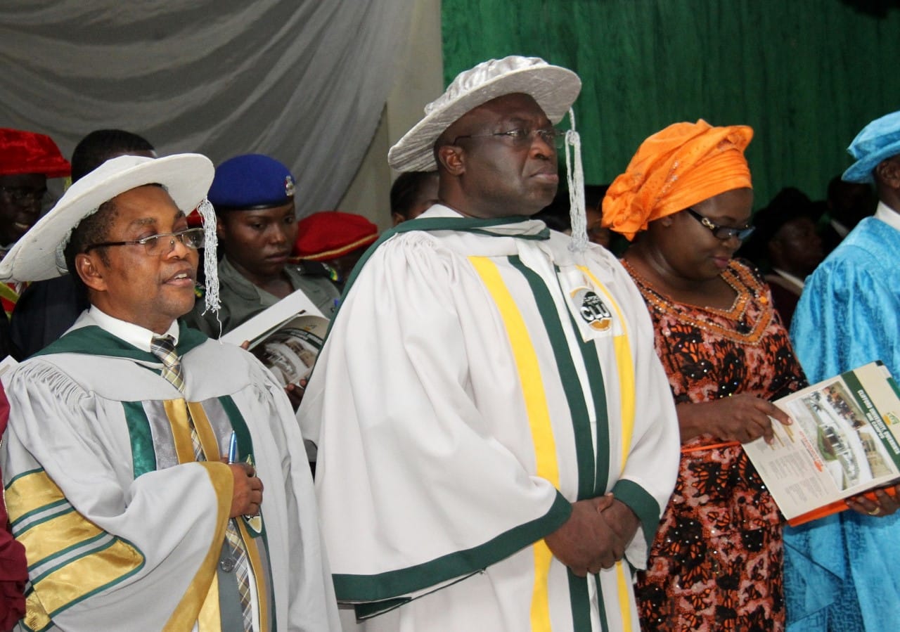 L-R: Prof. Chimezie Omonu, Vice Chancellor and Secretary to the Governing Council, Clifford University; Abia State Governor, Dr. Okezie Ikpeazu, and his wife, Nkechi, at the maiden matriculation ceremony of Clifford University, Owerrinta, Isiala-Ngwa North of Abia State.