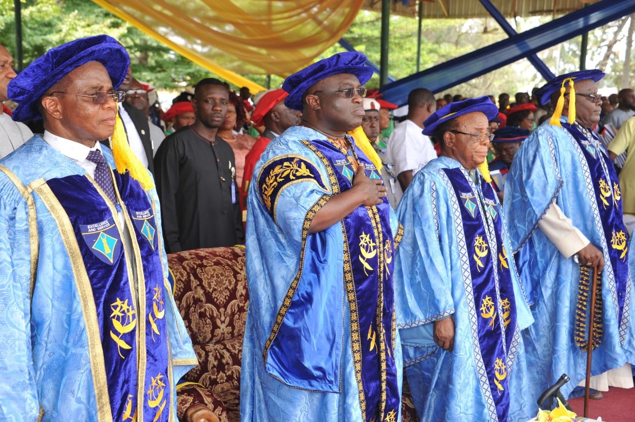 L-R: Vice Chancellor, Abia State University (ABSU), Prof. Uche Ikonne; Abia State Governor and Visitor to ABSU, Dr. Okezie Ikpeazu; Chancellor, Sir Francis Orji and Pro-Chancellor, Senator Adolphus Wabara, during the 25th Convocation ceremony of the university in Uturu…on Saturday.