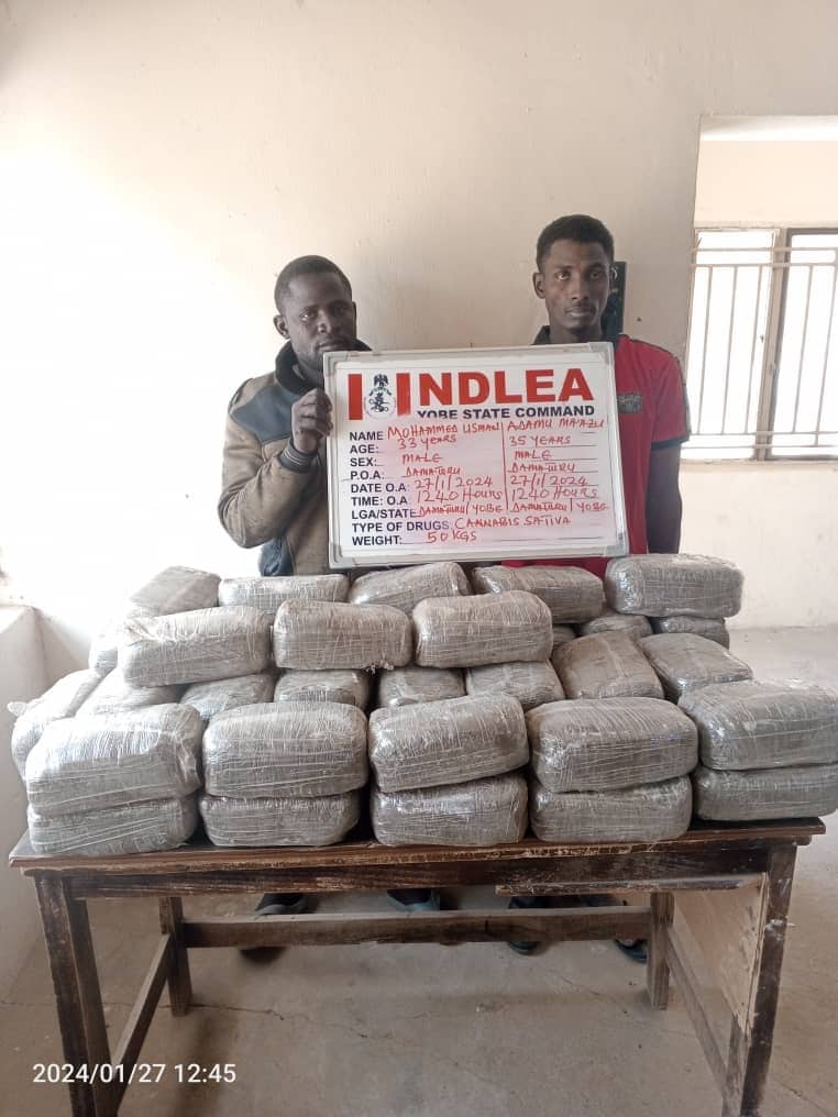 In Yobe state, two suspects: Mohammed Usman and Adamu Ma’azu were arrested on Saturday 27th January with 49 blocks of cannabis sativa weighing 50kg at Damaturu motor park, Damaturu, while the duo of Paul Obor, 38, and Dennis Fuokorighe, 48, who were arrested on Wednesday 24th Jan. at a Navy check point, Itobe, Ofu LGA, Kogi state with 318 compressed blocks of cannabis sativa weighing 190.8kg concealed in a gold colour Honda Accord Car marked RBC 449AE, were handed over to the Kogi state command of the Agency on Friday 26th Jan. by men of the Nigeria Navy Ship, Lugard, Lokoja.