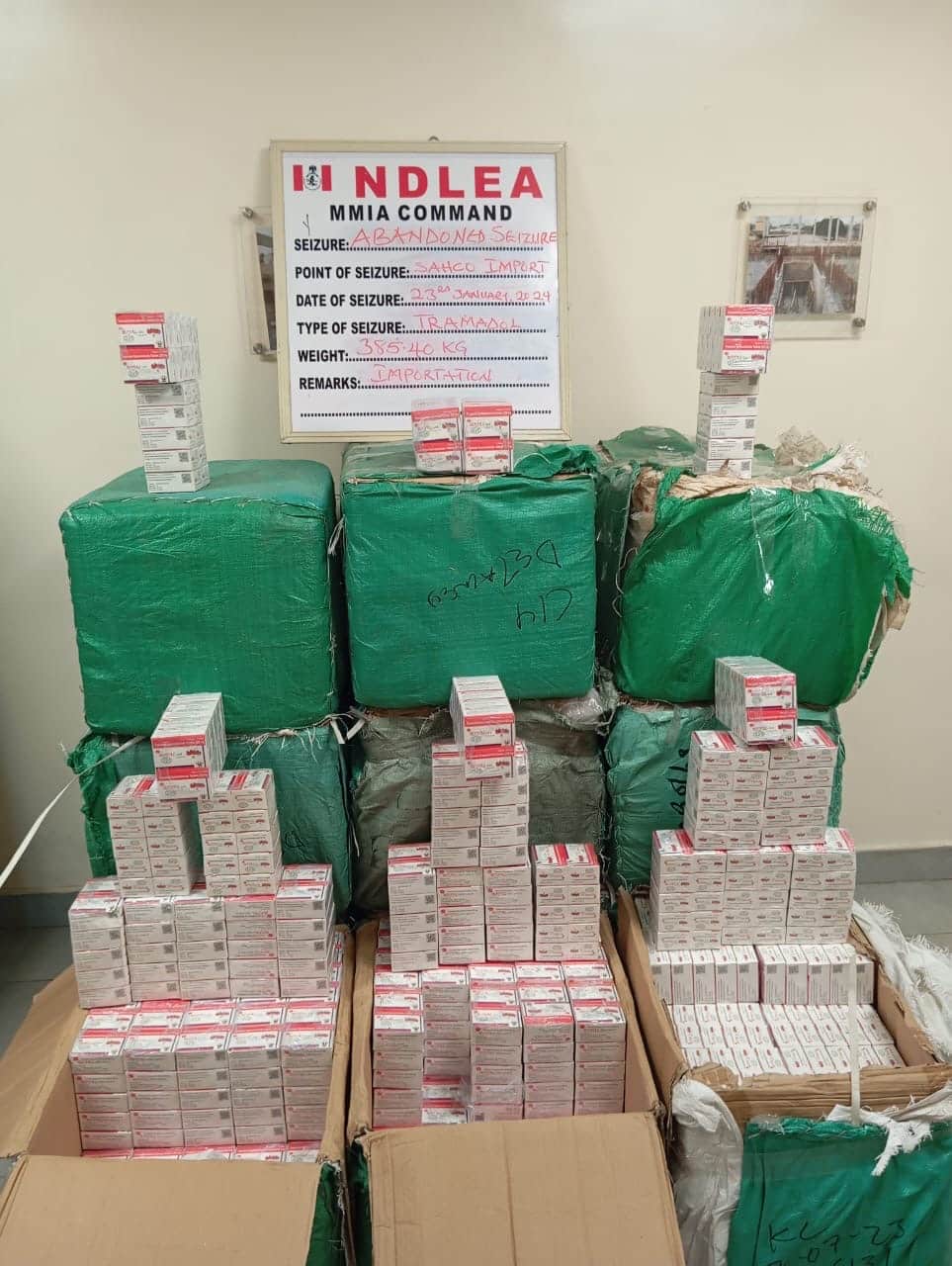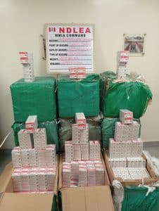 In the same vein, NDLEA operatives at the Lagos airport on Tuesday 23rd January recovered a total of twelve (12) cartons of tramadol 225mg containing five hundred and ninety-nine thousand, nine hundred (599,900) pills weighing 385.40kg from an overstayed cargo at the SAHCO import shed of the Lagos airport after a joint examination with other agencies.