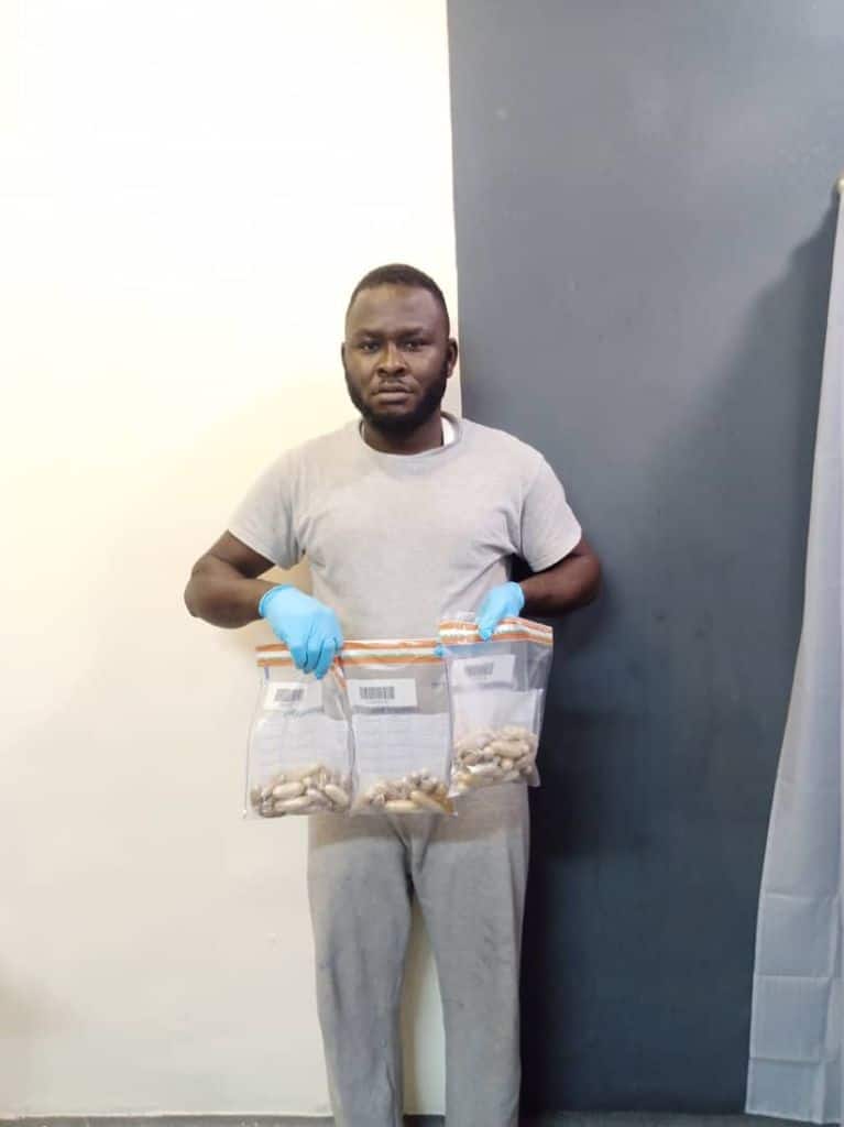 Also at the Lagos airport, NDLEA operatives arrested an Italy-bound passenger, Abibu Miminu, during the outward clearance of passengers on Ethiopian Airways flight to Italy via Addis-Ababa for ingesting illicit drugs. While under observation at the Agency’s facility between Saturday 14th and Sunday 15th August, 2021, the trafficker excreted 68 wraps of heroin in three excretions, all weighing 800grams.