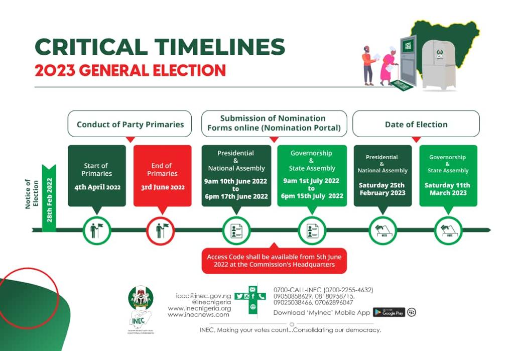 “Submission of nomination forms to INEC via the online portal for Presidential and National Assembly election – 9.00a.m.,on Friday June 10 to 6.00p.m.,on Friday June 17,” he said.