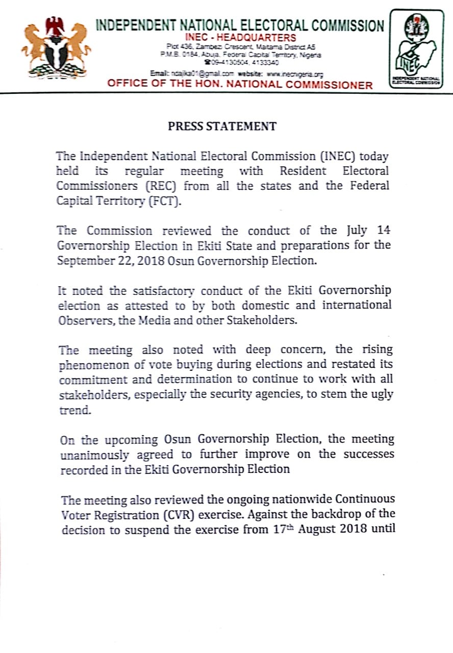 The Commission reviewed the conduct of the July 14 Governorship Election in Ekiti State and preparations for the September 22, 2018 Osun Governorship Election.