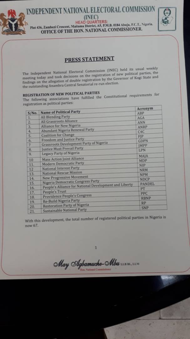 New Progressive Movement (NPM), Nigeria Democratic Congress Party (NDCP), People’s Alliance for National Development and Liberty (PANDEL), People’s Trust (PT) and Providence People’s Congress (PPC) were also registered.