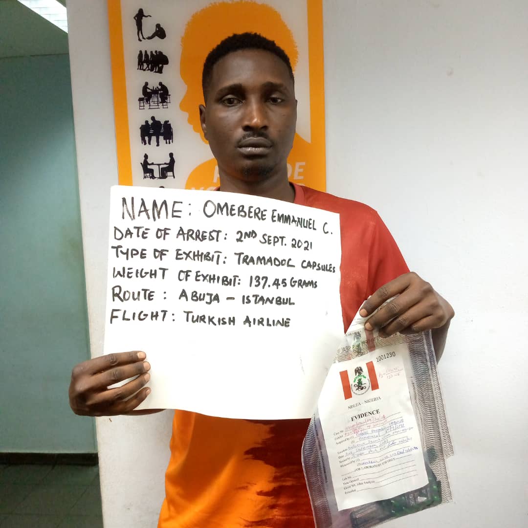 Attempts by a female passenger, Isesele Obehi and one Emmanuel Chibuzor Omebere to export illicit drugs to Europe through the Murtala Muhammed International Airport, MMIA, Lagos and Nnamdi Azikiwe International Airport, Abuja were thwarted by narcotic officers who arrested them shortly before they boarded their flights. While Isesele was nabbed on Saturday 11th September, 2021 during outward clearance of Ethiopian Airline flight at Gate B departure hall of the Lagos airport on her way to Milan, Italy with three hundred and twelve (312) sachets of Tramadol, weighing 1.5kg, concealed in crayfish and dried vegetables, Chibuzor was equally caught with 137.45 grams of the same drug concealed in foodstuff at the Abuja airport on Thursday 2nd Sept during outward clearance of Turkish Airline flight to Istanbul, Turkey.
