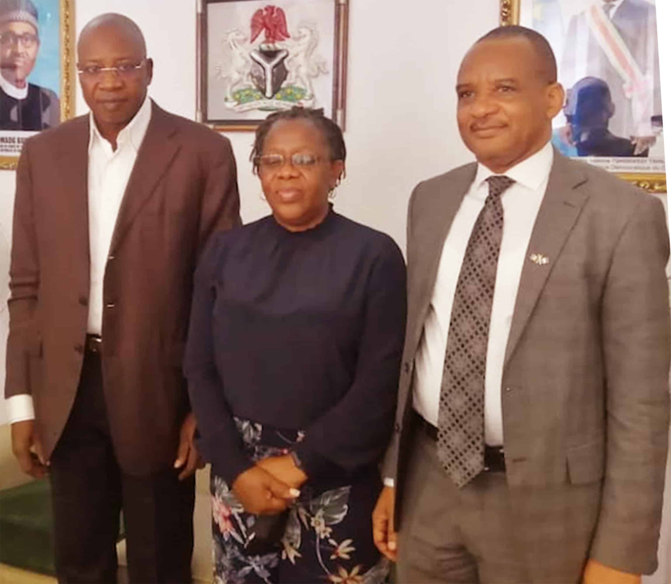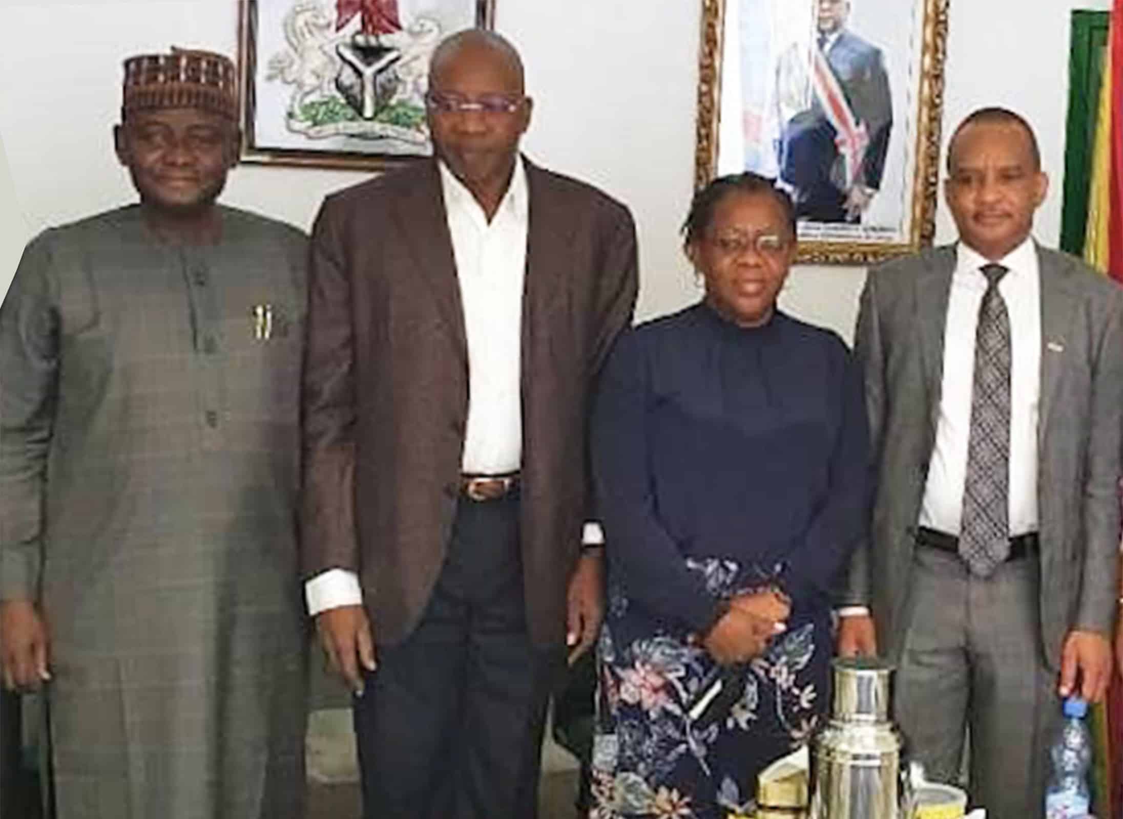 From right: Director General, Nigerian Maritime Administration and Safety Agency (NIMASA), Dr. Bashir Jamoh; Permanent Secretary, Federal Ministry of Transportation, Dr. Ajani Magdalene; Nigerian Ambassador to the Democratic Republic of Congo, Ambassador Umar Suleiman and Coordinator, Abuja Zonal Office (NIMASA), Mr. Zailani Attah, during a courtesy visit to the Ambassador of Nigeria to the Democratic Republic of Congo in Kinshasa.