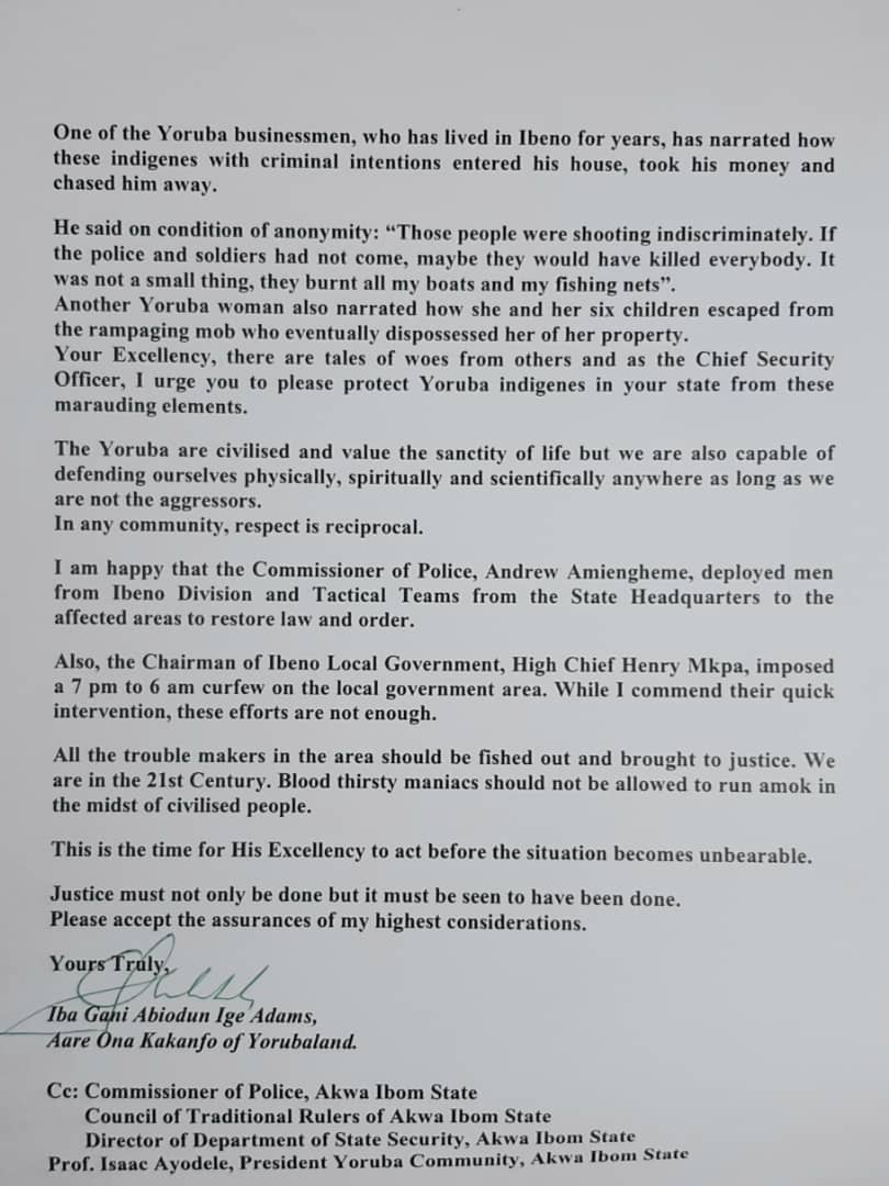 I’m writing this letter to inform you of the security report I received on killings of some Yoruba residents in your state.