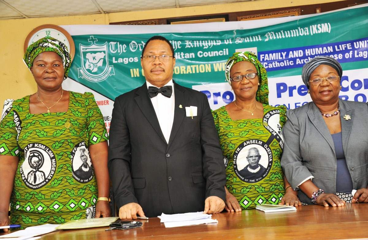 L-R: Lady Elizabeth Kolawole, representative of President, Lagos Metropolitan Council; Knights of Saint Mulumba, Lagos Metropolitan Grand Knight, Dr. Charles Mbelede; Ladies of Saint Mulumba (LSM) Financial Secretary, Lagos Metropolitan Council, Lady Bridget Edoro; and Pro Life Consultant, Dr. Henrietta Williams (representative of Family and Human Life Unit, Catholic Archdiocese of Lagos) at a press conference to signpost the 2016 Vigil on abortion by Knights of Saint Mulumba…on Thursday.