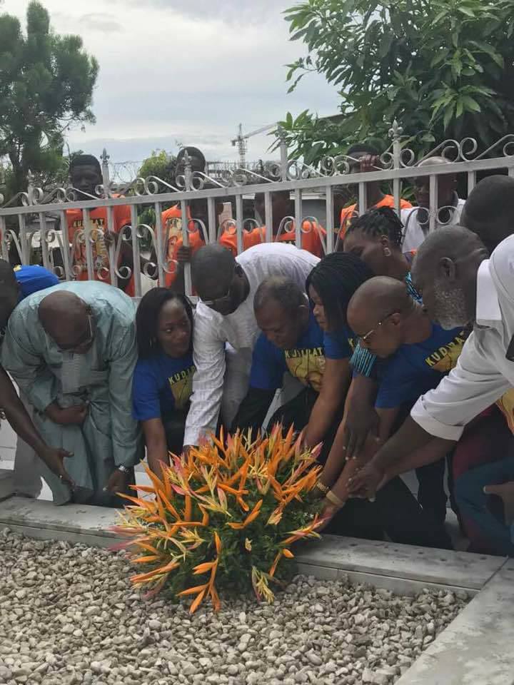 National Coordinator of Oodua Peoples Congress (OPC), Otunba Gani Adams, Dr. Joe Okei-Odumakin, Admiral Ndubuisi Kanu, Hafsat Abiola and others laying a wreath at the tomb of Alhaja Kudirat Abiola, wife of the winner of the June 12, 1993 presidential election, Chief M.K.O. Abiola, at Ikeja…on Sunday. She was assassinated on June 4, 1996 near 7UP Junction, Ikeja, Lagos.