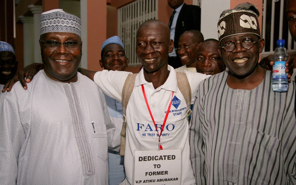 L-R: Former Vice President and chieftain of the All Progressives Congress (APC), Atiku Abubakar; the man who trekked from Yola to Abuja to congratulate the former Vice President on APC’s electoral victory, Malam Abubakar Dudu Wali and APC National Leader, Asiwaju Bola Tinubu, when the duo received Wali at Atiku’s Asokoro residence in Abuja.