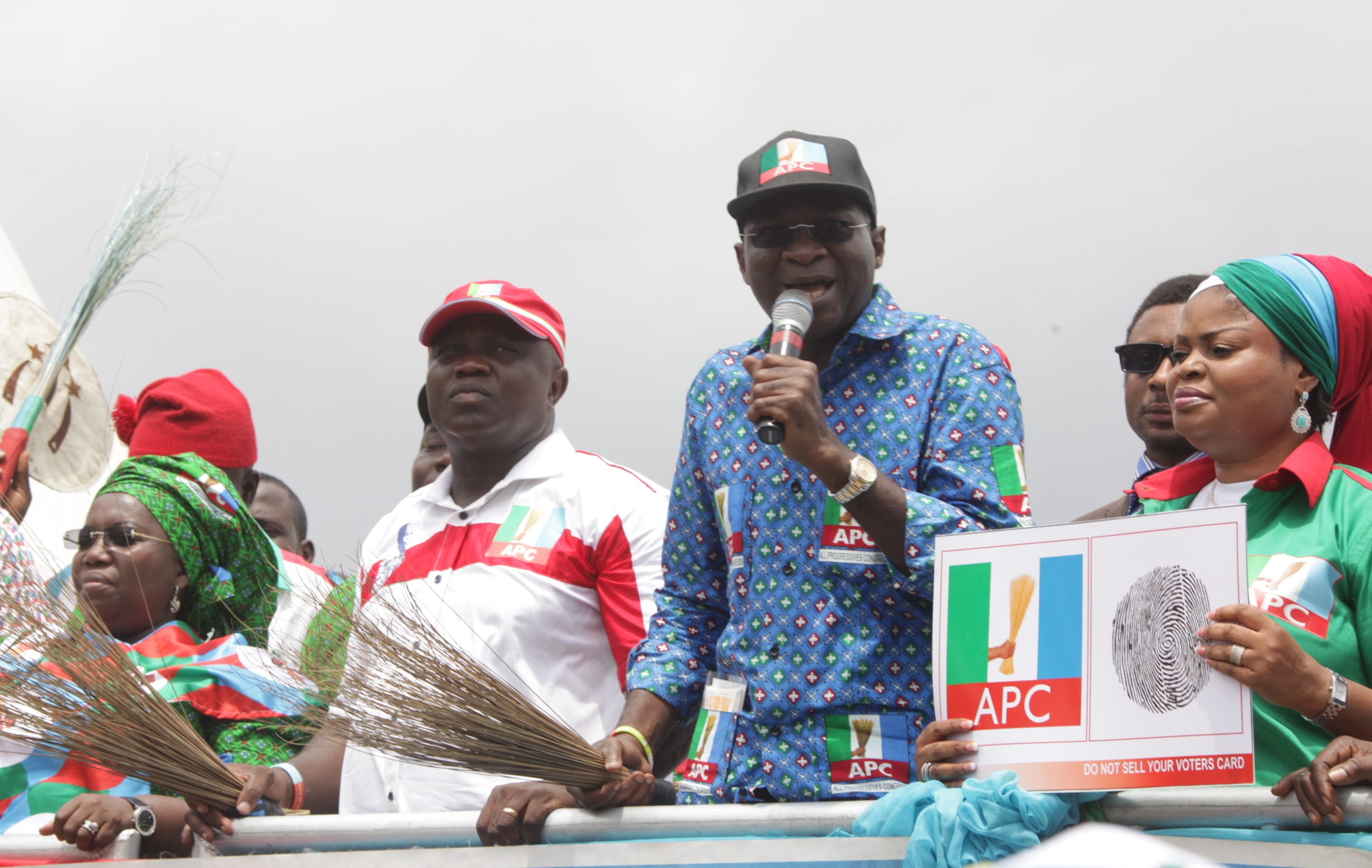 Lagos State Governor, Mr. Babatunde Fashola (second right), his deputy, Mrs. Adejoke Orelope-Adefulire (right), the All Progressives Congress (APC) Governorship Candidate in Lagos State, Mr. Akinwunmi Ambode (second left) and his running mate, Mrs. Oluranti Adebule (left) during the All Progressives Congress (APC) Governorship Campaign Rally at the Mini Stadium, Ifako-Ijaiye, Lagos, on Thursday.