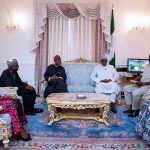 President Muhammadu Buhari throwing banters when he met Alhaji Lai Mohammed, Minister of Information and Culture; Mr Femi Adesina, Special Adviser on Media and Publicity; Mallam Garba Shehu, Senior Special Assistant on Media and Publicity; Lauretta Onochie, Personal Assistant on Digital/Online Media and Mrs Abike Dabiri-Erewa, Senior Special Assistant on Diaspora Matters in London…on Saturday.