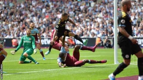 Raheem Sterling scored a hat-trick as champions Manchester City made a hugely convincing start to their title defence with a 5-0 win at West Ham United on Saturday, in a game which saw heavy use of video review.