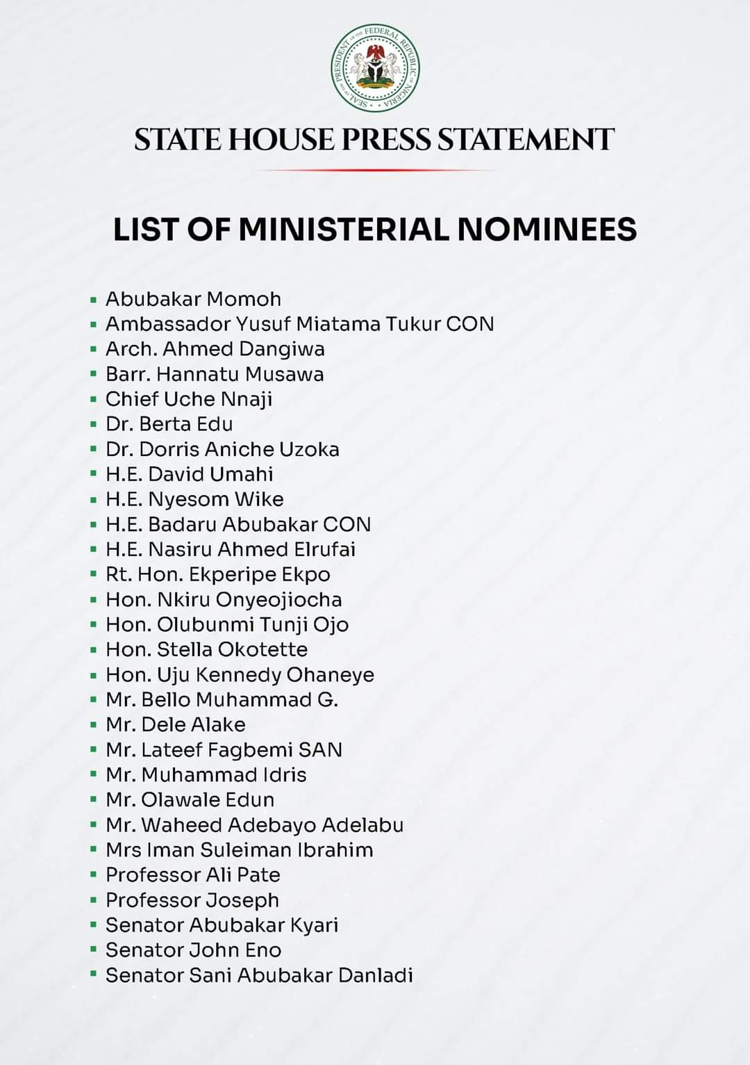 The list also has Mrs Iman Ibrahim,Prof.Ali Pate, Prof.Joseph Utsev, Sen.Abubakar Kyari, Sen.John Eno ,and Sani Abubakar Danladi.