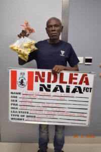 The NDLEA arrested a 67-year-old drug trafficker, Clement Chukwuemeka at the Nnamdi Azikiwe International Airport, Abuja on Oct. 3 for ingesting 100 wraps of cocaine.