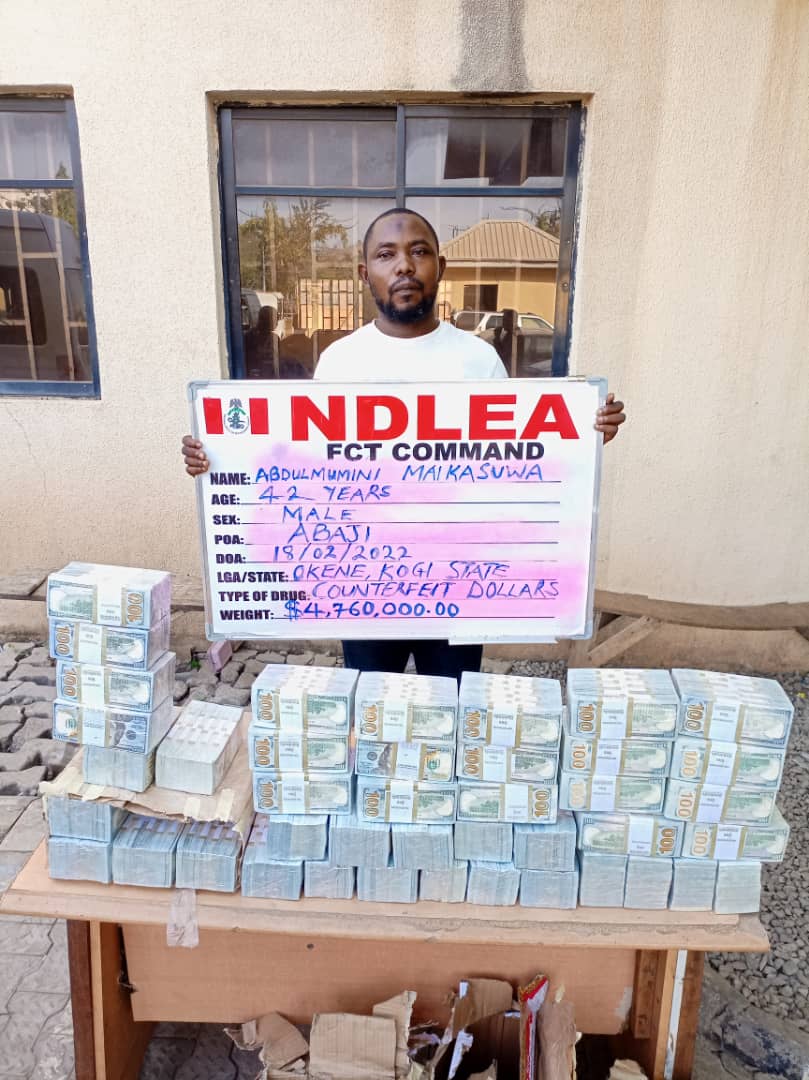 The operatives had in the early hours of Friday 18th February 2022 intercepted a consignment sent from Lagos to Abuja at Abaji area of the Federal Capital Territory. A controlled delivery of the parcelled counterfeit US dollars totalling $4, 760, 000.00 led to the arrest of a principal suspect, 52-year-old Abdulmumini Maikasuwa.