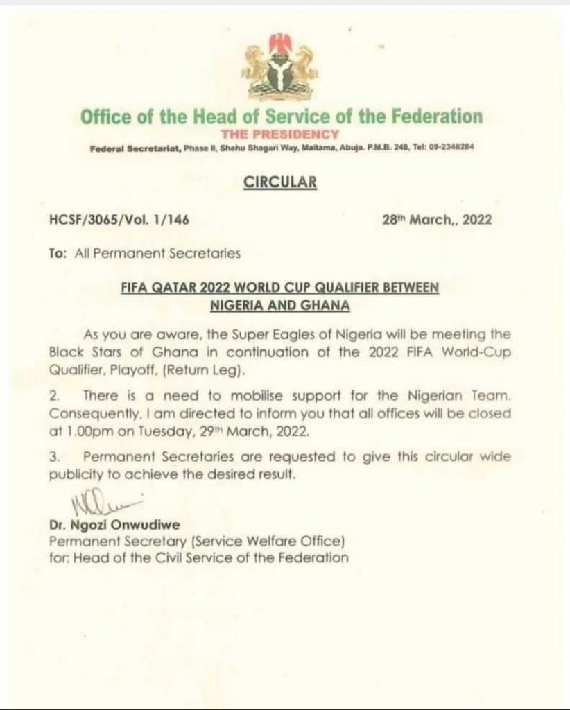 The Federal Government has directed all offices to close by 1p.m. on Tuesday, so as to mobilise support for the Super Eagles of Nigeria.